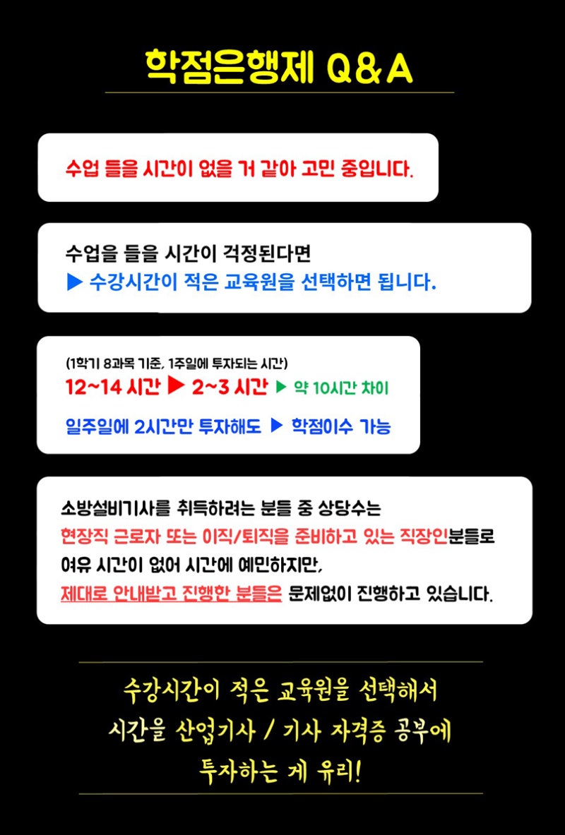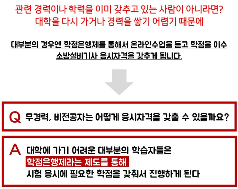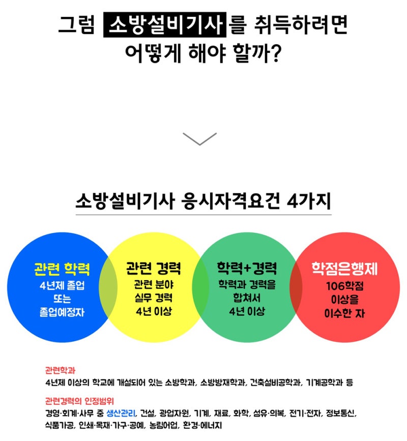 소방설비기사가 되기 위해 자격 요건을 충족하고 시험을 치르려면 기본적으로 대학에서 관련 분야 학사학위를 취득하거나 최소 4년 이상의 경력이 있어야 한다고 하는데, 저는 그렇게 할 수 있었습니다. 3개월 반 동안 수업을 듣고 자격을 갖추면, 경험이나 교육이 없어도 소방기술사 국가자격 시험에 응시할 수 있습니다. 있었다