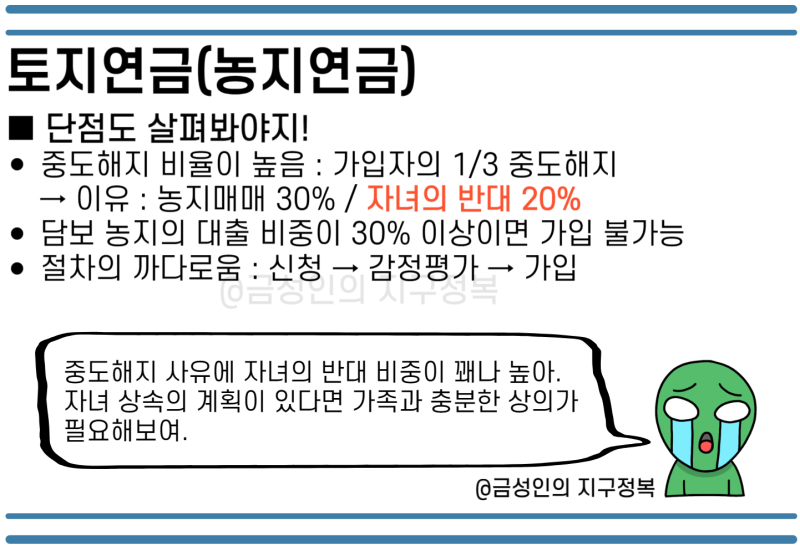 pension은 연금이 예상보다 적을 수 있습니다. 따라서 예상보다 적은 것을받을 수 있다는 점을 명심해야합니다. 실제로, 농지의 가격이 예상보다 낮거나 금리가 상승하면 연금을 줄일 수 있기 때문에 신청하기 전에 정확한 정보를 얻는 것이 중요합니다. 전문가로부터 상담을받는 것이 좋습니다. ② 농지 가격이 하락하면 연금이 줄어들거나 연금 지불이 중단 될 수 있습니다. 가격 변동의 위험은 농지 연금의 큰 단점 중 하나입니다. 따라서 가격의 안정성을 미리 확인하고 위험 관리 계획을 세우는 것이 중요합니다. 위치와 토양을주의 깊게 확인하는 것이 좋습니다. 우리는 상환 의무에서 모기지의 성격을 가지고 있습니다. 연금 수령인이 계약을 종료하거나 종료하면 나머지 부채는 상환되어야합니다. 용량이 부족한 경우 농지를 처분해야 할 수도 있으므로 계약 전에 상환 조건을 확인하고 재정 상황을 정확하게 식별하는 것이 중요합니다. 상속인에게 부담이 될 수 있다는 것을 잊지 마십시오. 농지 연금 신청의 주제와 조건은 무엇입니까?