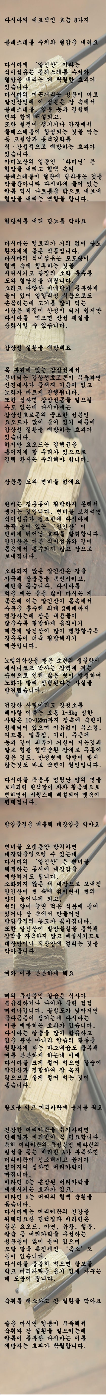 혈압 조절 다시마에는 칼륨이 풍부하여 혈압 조절에 도움이 됩니다. 칼륨은 나트륨 균형을 유지하고 혈압을 안정시키는 데 도움이 됩니다. 피부 건강 개선 다시마의 미네랄과 비타민은 피부 건강을 지원합니다. 특히 다시마에는 콜라겐 형성과 피부 탄력 유지에 도움을 주는 미네랄이 함유되어 있습니다. 이러한 이유로 다시마는 영양분이 풍부하고 다양한 건강상의 이점을 제공하는 식품 중 하나입니다. 그러나 개인의 건강상태를 고려하여 항상 적정 섭취량을 유지하고 다양한 식품을 섭취하는 것이 중요합니다.