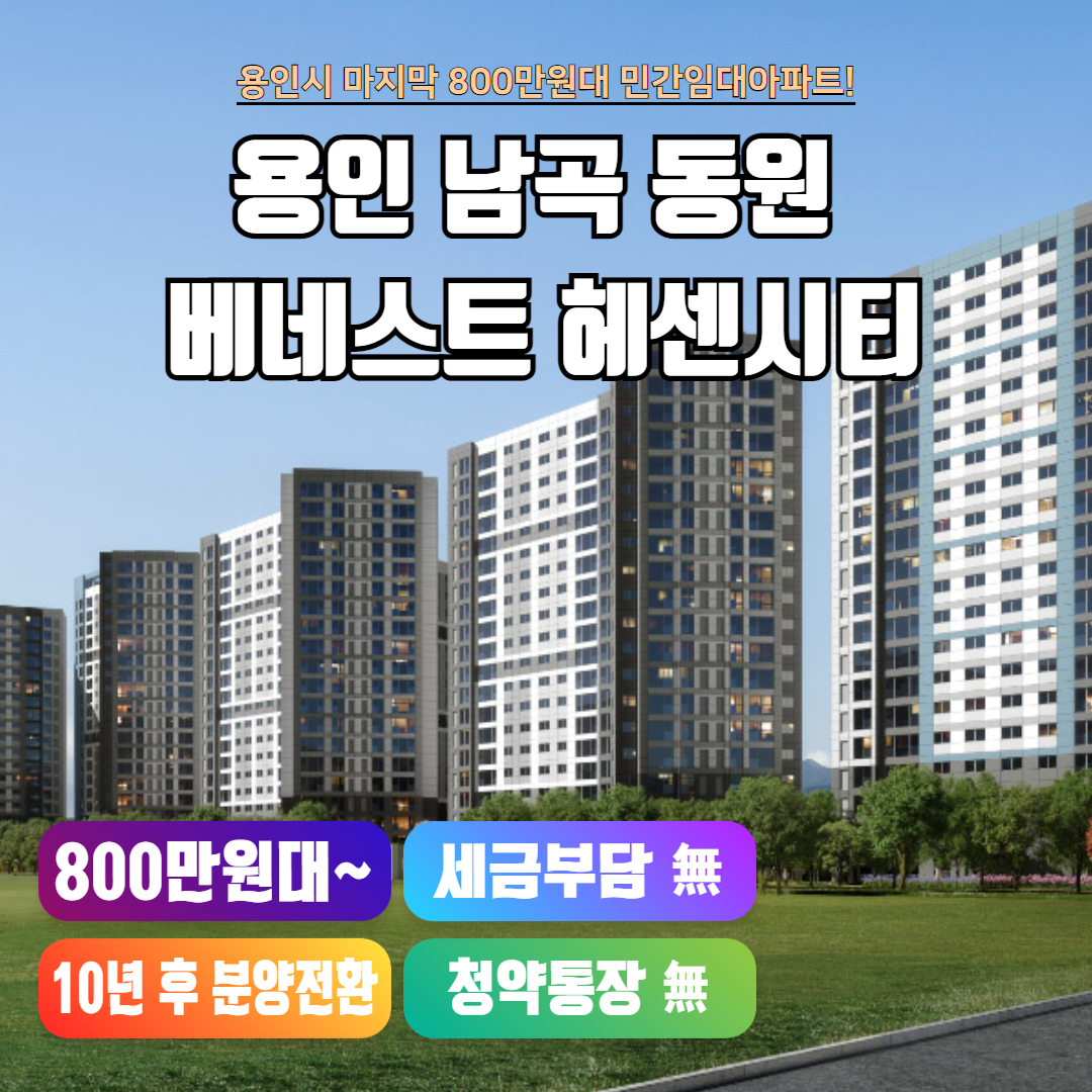 요즘은 임대아파트가 많이 공급되는 추세입니다. 일반 매매현장에서는 가격이 너무 많이 올랐기 때문에 신축을 받고 싶다면 민간임대아파트를 알아보는 것도 좋은 대안이 될 수 있습니다. 이런 관점에서 이번에 소개할 두 번째 장소는 다양한 장점을 지닌 동원베네스트 헤센시티, 용인 남곡이다.