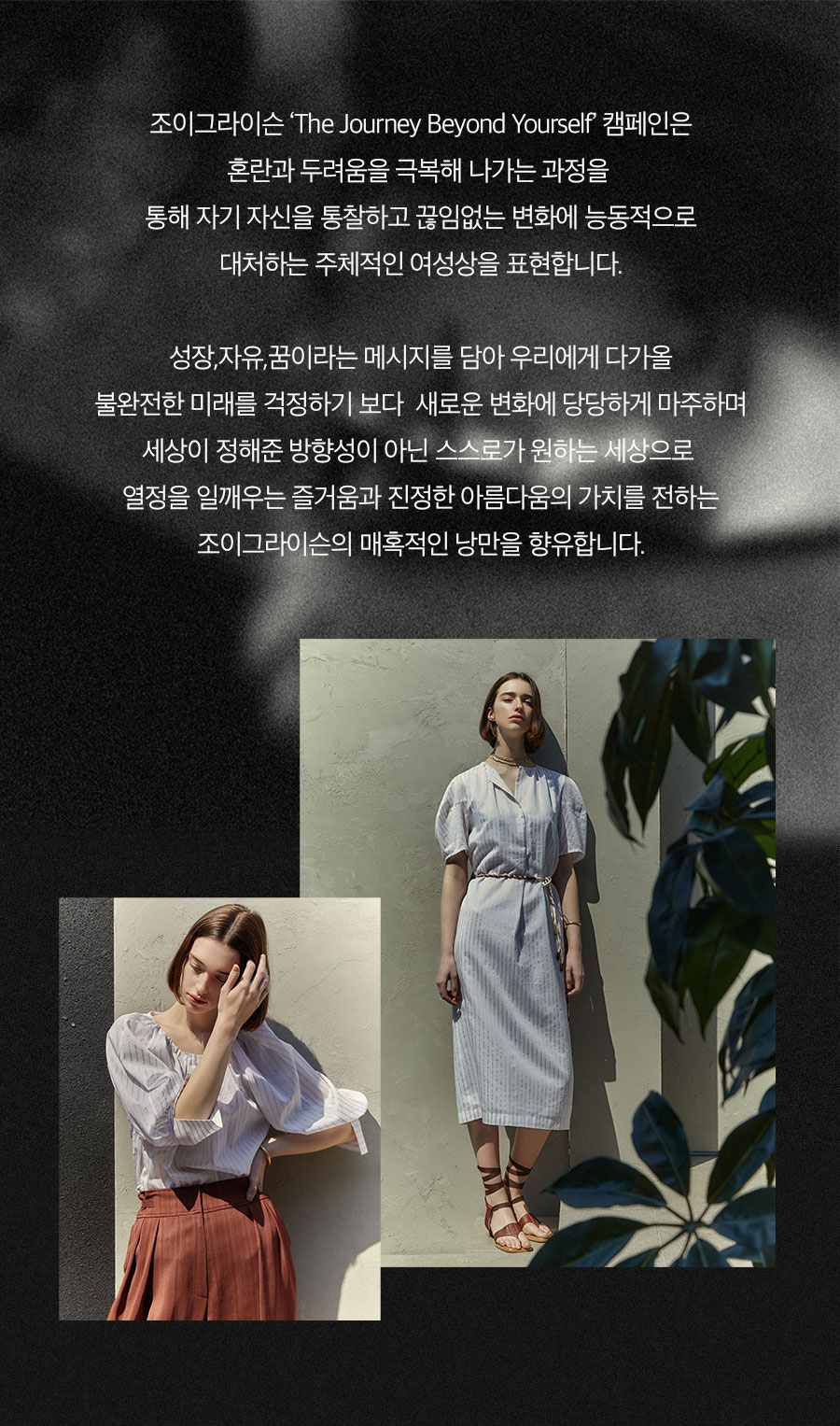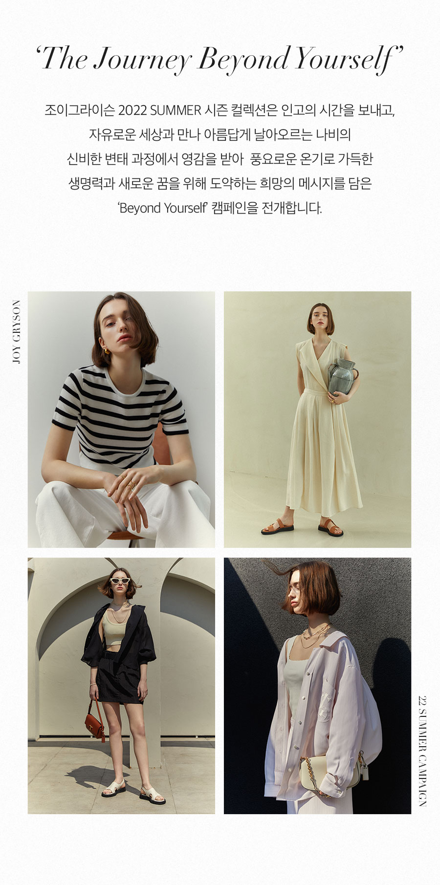 조이 그리슨(Joy Gryson)은 세계적인 동명의 디자이너가 2006년 미국 뉴욕에서 런칭한 컨템포러리 패션 브랜드입니다. 시대를 초월한 클래식을 모던한 감성으로 재해석한 의류와 핸드백을 선보입니다. 조이 그리슨 RTW는 유연하면서도 디테일한 실루엣과 시크한 디자인을 자랑합니다. 감성적인 무드와 세련되고 감각적인 의류 컬렉션을 선보이며 국내에서도 많은 사랑을 받고 있습니다.
