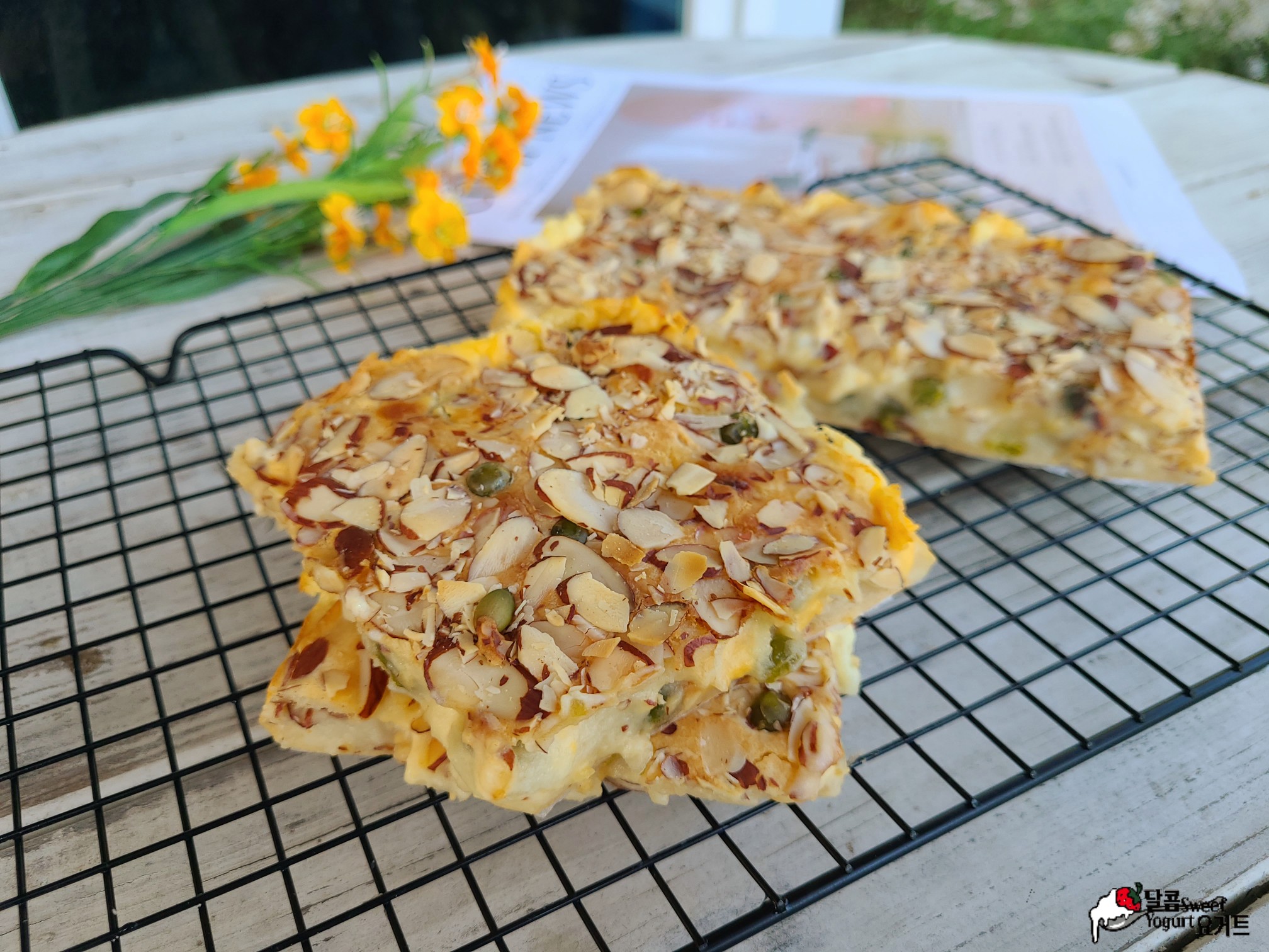 우선 견과류를 넣을 예정이라 미리 볶아두었어요. 구운 견과류이긴 하지만 그대로 넣으면 식감이 좋지 않더라구요. 에어프라이어에 넣고 180도에서 5분간 바삭하게 구워졌습니다.