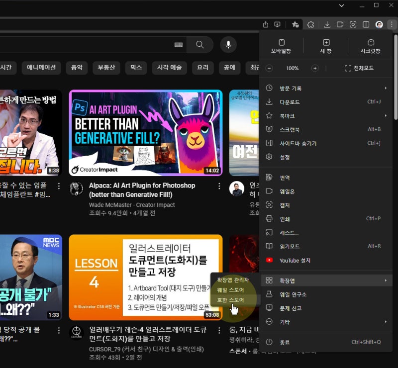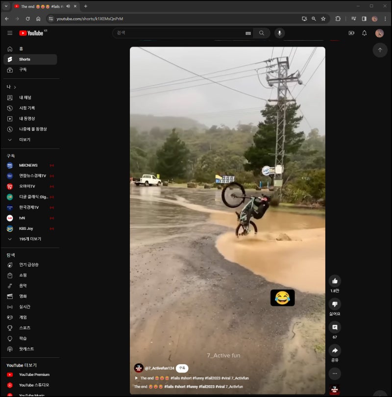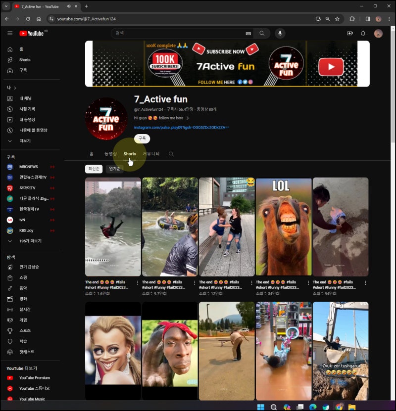 ▲ 좋아하는 크리에이터의 유튜브 단편만 보고 싶다면 해당 채널의 (쇼트) 메뉴를 열고 영상을 재생해 보세요. 다음으로 Edge 브라우저를 살펴보겠습니다. 엣지 브라우저