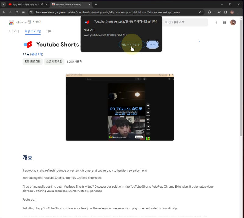 ▲ 크롬 웹스토어 페이지가 열리면 (Youtube Shorts)를 검색해 ‘Youtube Shorts Autoplay’ 확장 프로그램을 추가해 주세요.